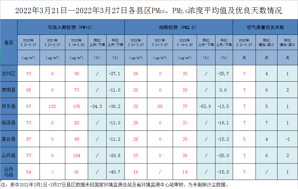 張掖市各縣區空氣質量周報