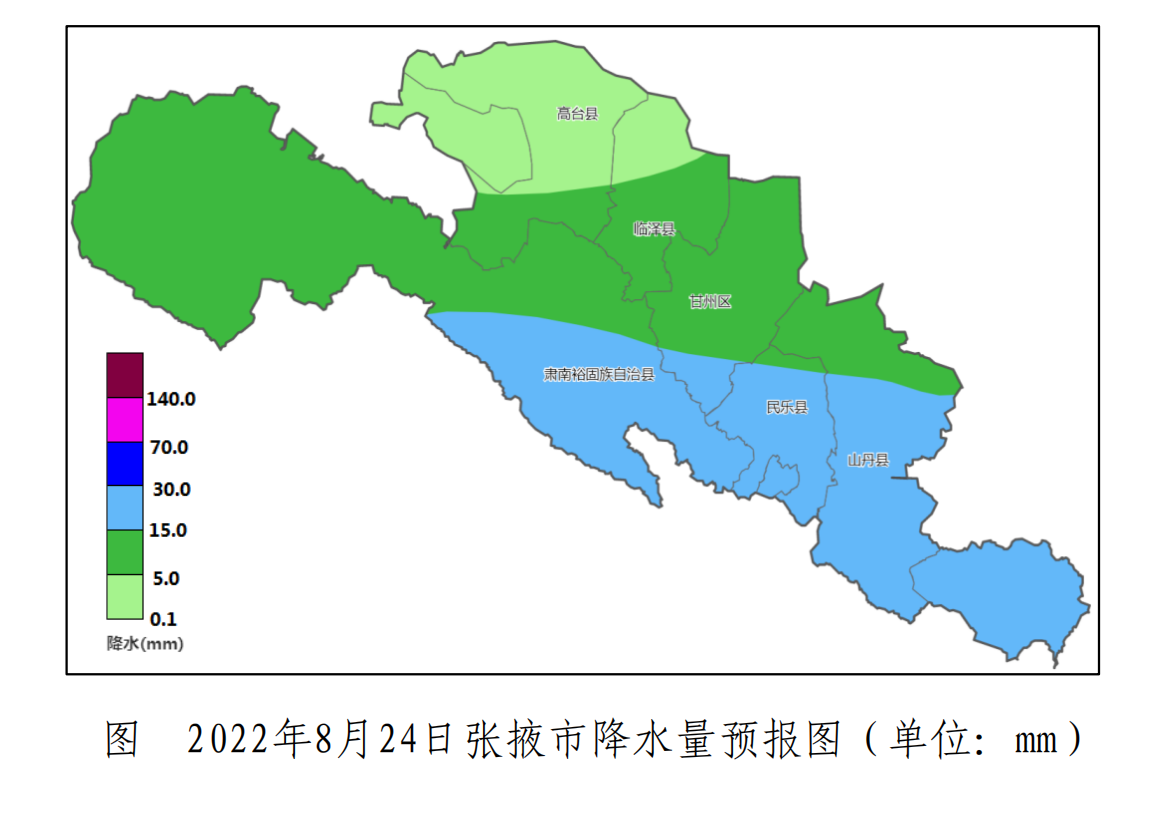 預計8月21—24日我市有持續性降水天氣過程。其中21日甘州、高臺、臨澤小到中雨,山丹、民樂、肅南中到大雨,降水量3-15mm ;22日高臺、臨澤中到大雨,民樂、肅南大雨,甘州、山丹北部暴雨,發生小時雨量大于10mm的短時強降水可能性較大,降水量10-35mm;23日高臺、臨澤小雨,甘州、山丹、民樂中雨,肅南中到大雨,降水量2-15mm;24日高臺、臨澤小到中雨,甘州、山丹、民樂、肅南中到大雨,降水量5-20mm。此次過程降水持續時間長,累計雨量大,降水疊加效應引發中小河流洪水和山洪地質災害氣象風險較高,請加強防范。