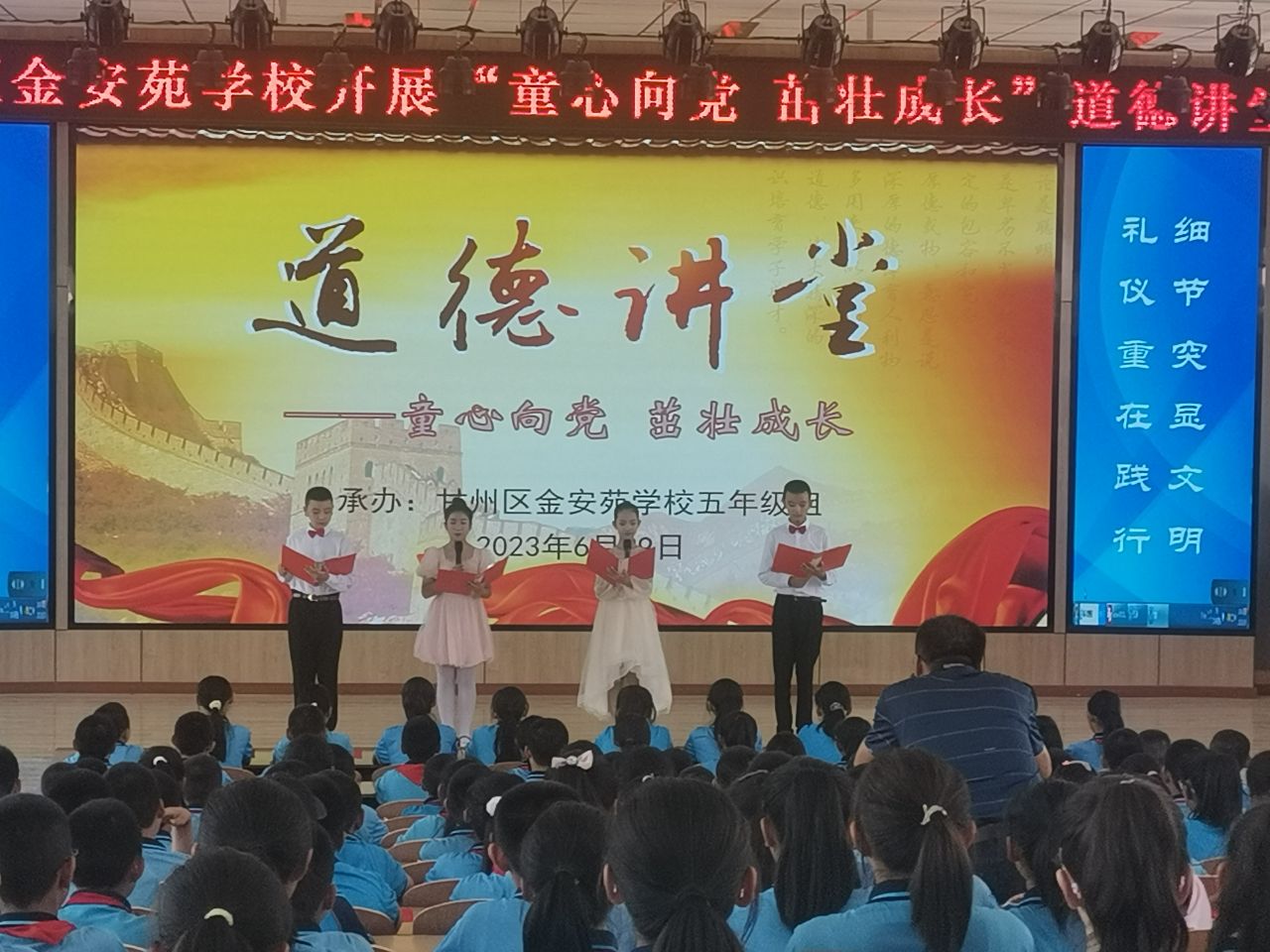 中國張掖網甘州訊 為深入開展愛國主義教育,厚植紅色基因和愛黨愛國情懷,將“三抓三促”行動在全校落實落細。近日,甘州區金安苑學校黨總支組織開展了“童心向黨 茁壯成長”道德講壇活動。