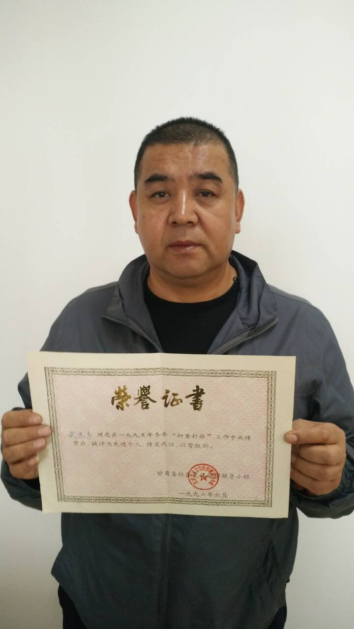 武忠東,男,1971年3月出生,1989年參加工作,現(xiàn)任甘州區(qū)文廣新局文化市場(chǎng)綜合執(zhí)法大隊(duì)大隊(duì)長(zhǎng)。1996在查處王家墩倉(cāng)庫(kù)放映黃色錄像中,遭50多名社會(huì)閑散人員圍攻,手部受傷縫合二十多針。在多年的執(zhí)法生涯中,武忠東及其家人遭受過(guò)恐嚇甚至傷害,他也沒(méi)有萌生調(diào)離這個(gè)崗位的念頭,反而更加堅(jiān)定了干好這項(xiàng)工作的信念。因其工作成績(jī)優(yōu)異,表現(xiàn)突出,于1996年榮獲原張掖市“先進(jìn)生產(chǎn)者”榮譽(yù)稱(chēng)號(hào)。
