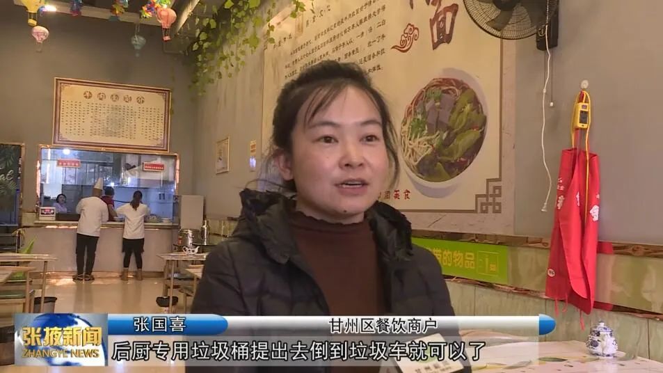 甘州區餐飲商戶張國喜:“我們的廚余垃圾現在都是通過門外面的垃圾車,后廚專用垃圾桶提出去倒到垃圾車就可以了,他們提供的這個服務讓我們特別的方便,而且后堂非常整潔干凈。”