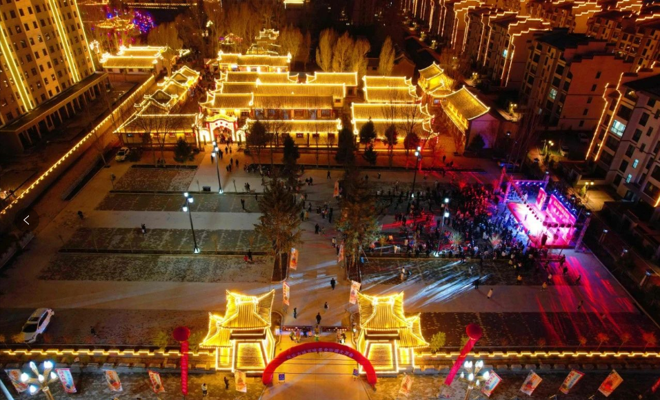 日暮漸晚,美麗的民樂古城夜經濟在流光溢彩的景觀燈與星空交相輝映下拉開帷幕。在如蝶般斑斕、如詩般浪漫的夜色中,美麗的燈光秀、月亮橋讓許多慕名而來的游客流連忘返。