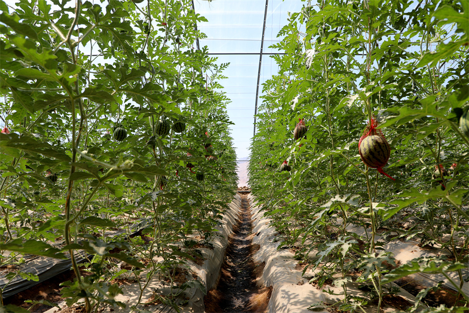 “別看它個頭小,但皮薄肉多、爽口甘甜、水分充足,口感和品質都非常好,吊蔓種植后,實現立體栽培,西瓜四面陽光均勻照射,也便于整蔓、打杈、掐尖、摘果,同時,通過采用人工授粉,提高了瓜秧坐果率,實現增產增效。”劉振華說。